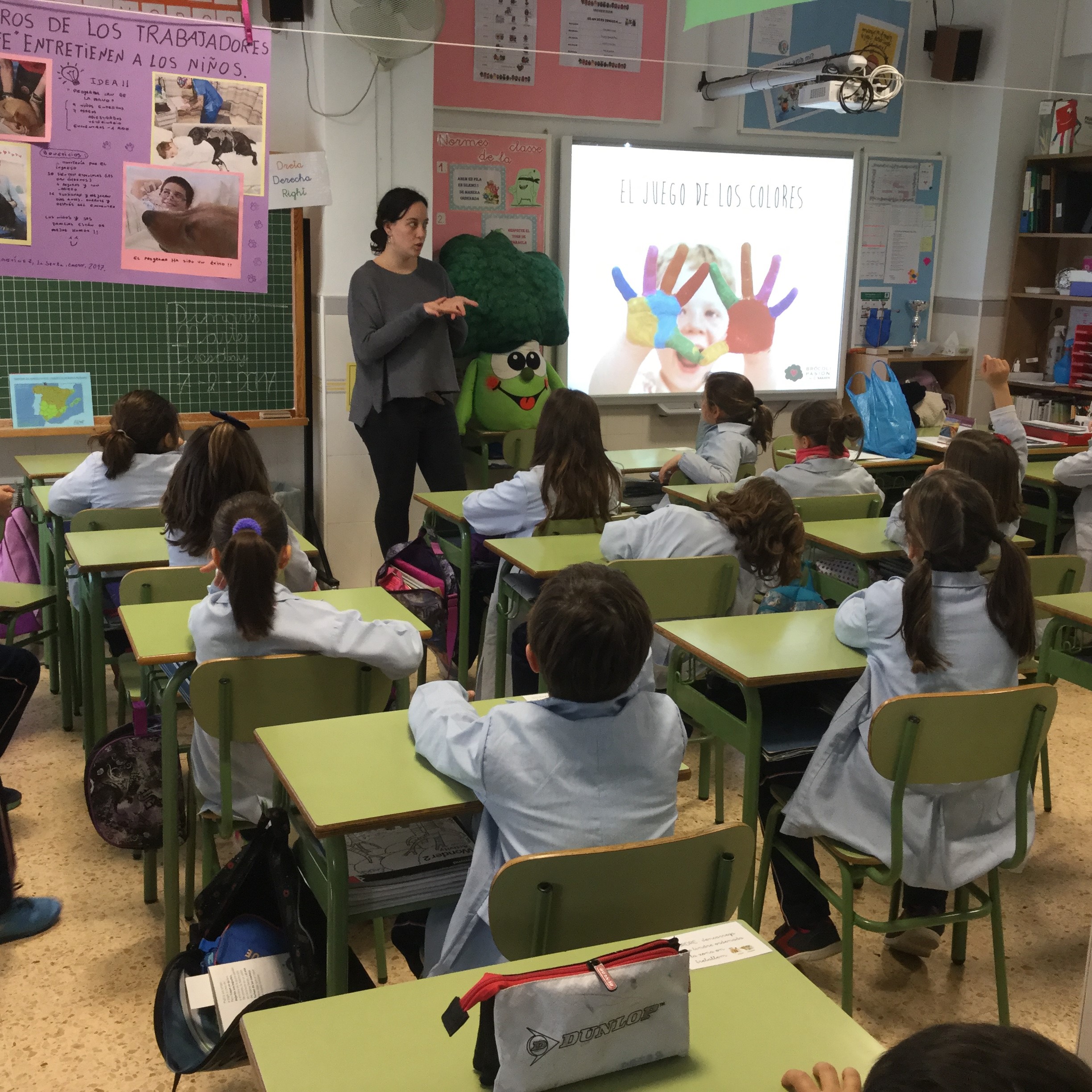 La actividad la desarrollamos en cada clase adaptaba al nivel que cada del curso. Aprendimos sobre porqué es bueno comer frutas y verduras de distintos colores con el juego de los colores, supimos cómo Brocolín, Coliflorcita y Repollito hicieron que en su cole aprendieran la importancia de comer 5 piezas de fruta y verdura al día. Y, en muchos casos nos dio tiempo a acabar bailando la canción de Brocolín.